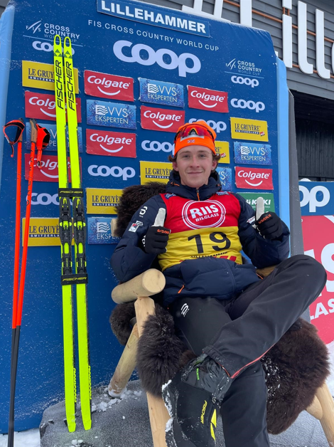 Then in Lillehammer, Norway, he placed 16th in the 10km Interval Start Free and got to enjoy quite a few minutes in the leader's chair (see photo below)! Full results: https://www.fis-ski.com/DB/general/results.html?sectorcode=CC&competitorid=221421&raceid=46742