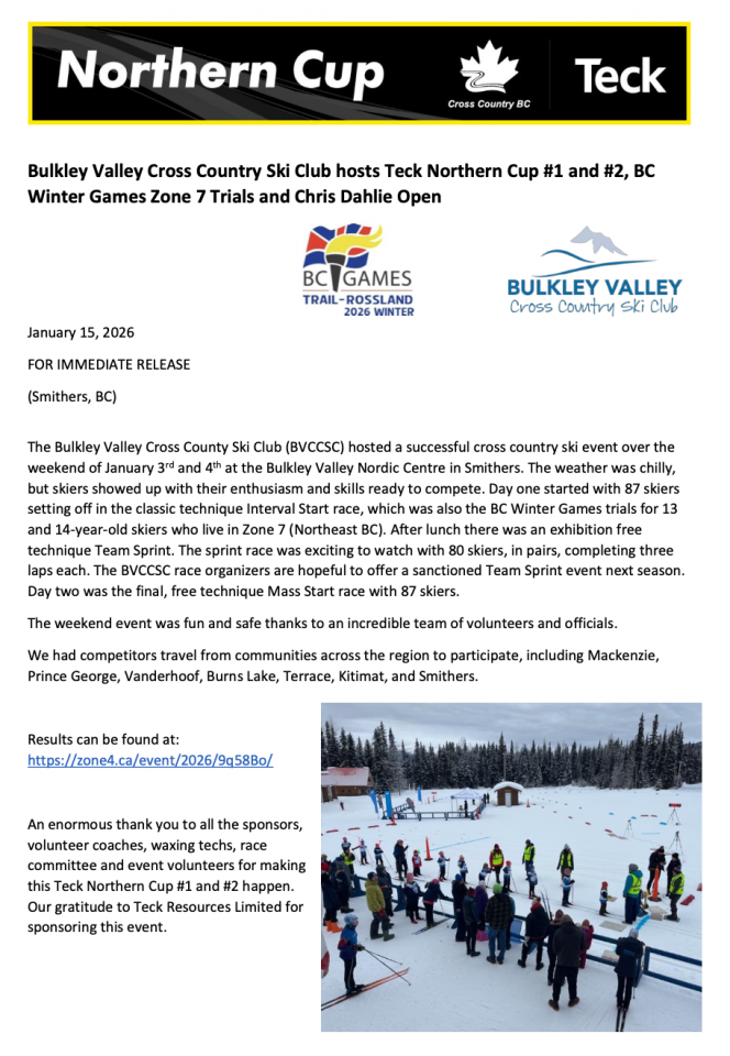 Press Release: Bulkley Valley Cross Country Ski Club hosts Teck Northern Cup #1 and #2, BC Winter Games Zone 7 Trials and Chris Dahlie Open »